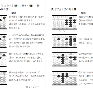 ソロバンの割り算について割られる数は、どの位置に置いたらいいのですか。 息子の割り算を見てるのですが、どうもわかりません。 例えば、① 13,104÷28 の13,10商と余りの関係 割り算をすると、必ず割り切れない数があります。5÷2は割り切れません。このとき、「余り」を加えることで、商を表すことができます。下式をみてください。 5÷2=2・・・1 のように、商は「2」、余りは「1」です。このとき,17を割られる数,3を割る数と呼ぶので,一般的には次のような関係が成り立つ. ( 割 ら れ る 数 ) = ( 割 る 数 ) × ( 商 ) ( 余 り ) また,(割る数) > (余り) ≧ 0 の関係がある.